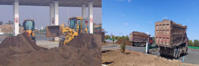 服務區(qū)開展綠化美化工作,土壤條件是關(guān)鍵。在集團項目分公司的協(xié)調(diào)支持下,內(nèi)蒙古交科路橋建設有限公司組織了34輛次的工程車輛,在響水服務區(qū)綠化帶更換了1400余方黑油砂土,平整到造型花池和綠化帶中,覆蓋了4000余平米,從根本上解決了響水服務區(qū)公共綠化區(qū)域“土質(zhì)差”問題,為服務區(qū)明年開展各類花卉的種植奠定了堅實的基礎。