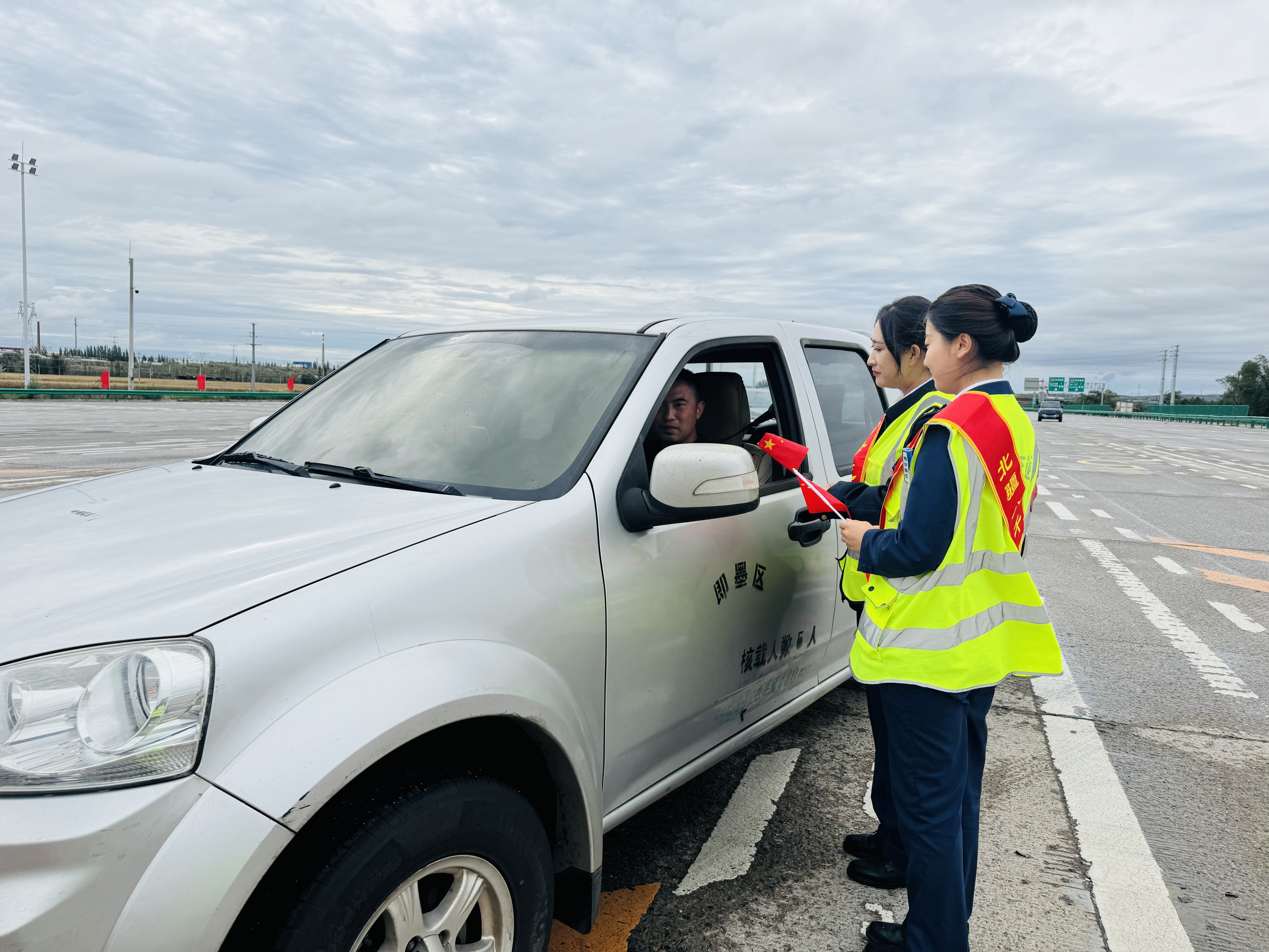 關碾房收費所在收費廣場設置便民服務臺,為廣大司乘提供高速公路地圖、應急藥品、維修工具、線路咨詢和政策宣傳等多項便民服務。他們還準備了小國旗,贈送給過往的司乘朋友,營造濃厚節(jié)日氛圍。