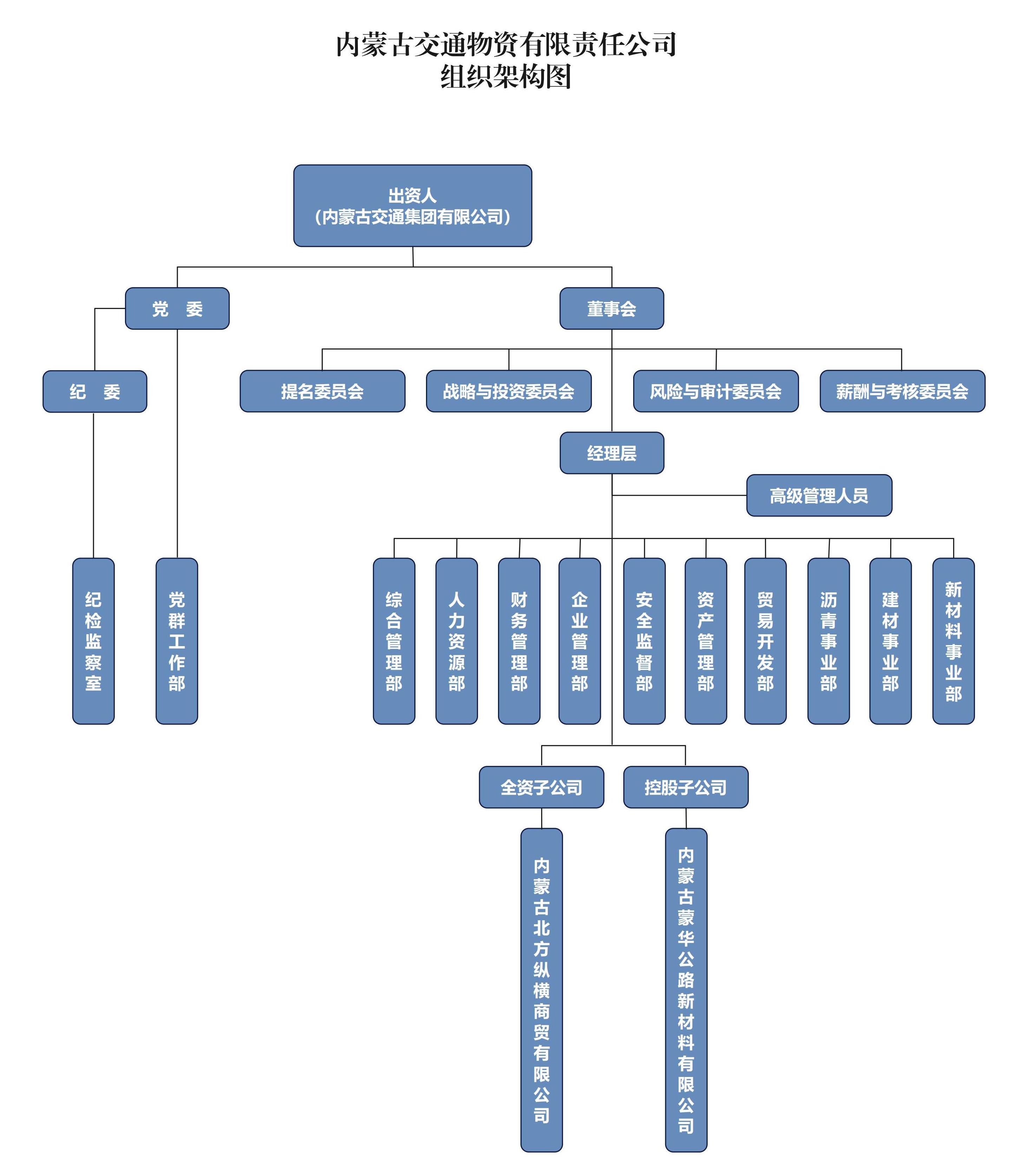 內蒙古交通物資有限責任公司(以下簡稱“公司”)于2000年成立,公司現(xiàn)由內蒙古交通集團有限公司(以下簡稱“集團”)履行出資人責任,以全資子公司方式全面納入集團經營管理體系。 公司注冊資本11億元,主要經營瀝青、鋼材、水泥等公路建設、公路養(yǎng)護物資,大宗物資貿易和房地產出租業(yè)務。 公司本部設有黨群工作部、紀檢監(jiān)察室、綜合管理部、人力資源部、財務管理部、企業(yè)管理部、安全監(jiān)督部,瀝青事業(yè)部、建材事業(yè)部、貿易開發(fā)部、資產管理部、新材料事業(yè)部等12個部室。擁有內蒙古北方縱橫商貿有限公司(控股),內蒙古蒙華公路新材料有限公司(控股)2家子公司。 自成立以來,公司在內蒙古交通運輸廳、集團的正確領導和社會各界的鼎力支持下,緊抓內蒙古自治區(qū)交通建設跨越式發(fā)展的契機,緊扣集團產業(yè)發(fā)展格局,以服務交通行業(yè)為方向,以深化企業(yè)改革為動力,以提高經濟效益為中心,以調整經營結構為重點,以完善經營設施為基礎,以強化內部管理為手段,建立現(xiàn)代企業(yè)制度,為實現(xiàn)企業(yè)高質量發(fā)展奠定基礎。 公司陸續(xù)獲得了內蒙古自治區(qū)交通廳“責任目標實績突出單位”、呼和浩特市工商行政管理局“守合同重信用單位”、內蒙古自治區(qū)省際通道建設管理辦公室“內蒙古省際通道建設項目特殊貢獻獎”、中國瀝青協(xié)會“中國瀝青行業(yè)十佳貿易商”、中石油燃料油有限責任公司“戰(zhàn)略合作伙伴”、河北倫特集團有限公司“2022年度優(yōu)質瀝青采購商”、山東高速華瑞道路材料技術有限公司“2022年度戰(zhàn)略客戶”、中國瀝青協(xié)會“2023年度中國瀝青行業(yè)民族貢獻獎”及“2023年度中國瀝青行業(yè)誠信單位”等榮譽。 |