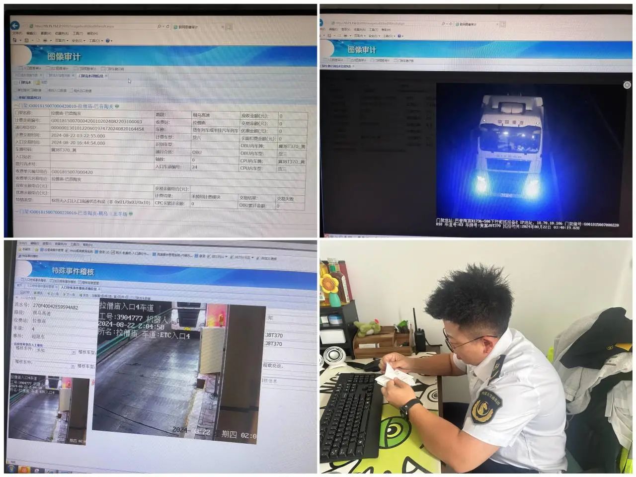 8月22日3點(diǎn)19分,一輛車牌號(hào)為冀J8T370的六軸貨車在拉僧廟收費(fèi)所入口4車道,無(wú)視收費(fèi)人員指揮,惡意闖關(guān)駛?cè)敫咚?。?dāng)班班長(zhǎng)反應(yīng)敏捷,立即上報(bào)值班所長(zhǎng)和路網(wǎng)監(jiān)測(cè)中心,并向高速交警報(bào)案。經(jīng)系統(tǒng)查詢確認(rèn),該車屬于超載車輛,存在嚴(yán)重違規(guī)行為。