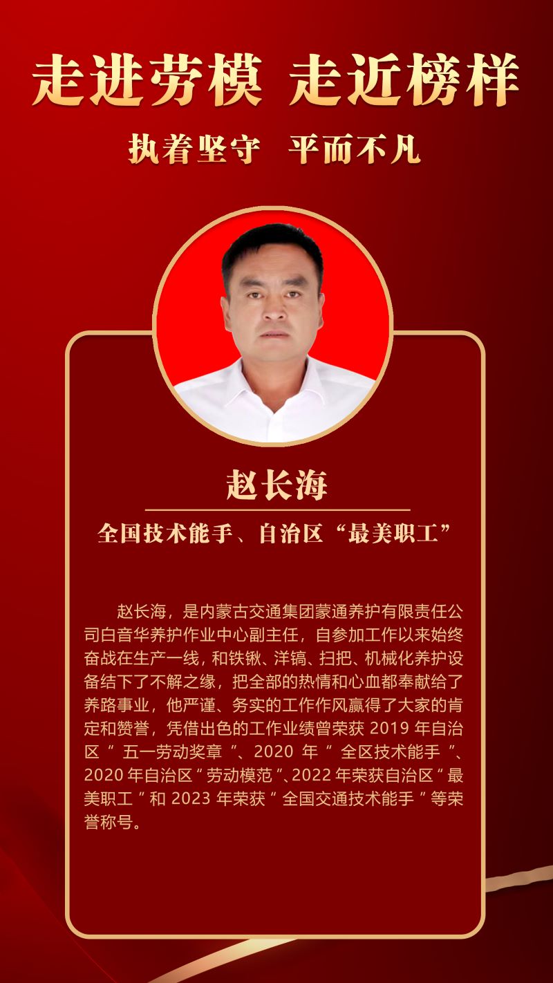趙長海,是內(nèi)蒙古交通集團蒙通養(yǎng)護有限責任公司白音華養(yǎng)護作業(yè)中心副主任,自參加工作以來始終奮戰(zhàn)在生產(chǎn)一線,和鐵鍬、洋鎬、掃把、機械化養(yǎng)護設備結下了不解之緣,把全部的熱情和心血都奉獻給了養(yǎng)路事業(yè),他嚴謹、務實的工作作風贏得了大家的肯定和贊譽,憑借出色的工作業(yè)績曾榮獲2019年自治區(qū)“五一勞動獎章”、2020年“全區(qū)技術能手”、2020年自治區(qū)“勞動模范”、2022年榮獲自治區(qū)“最美職工”和2023年榮獲“全國交通技術能手”等榮譽稱號。