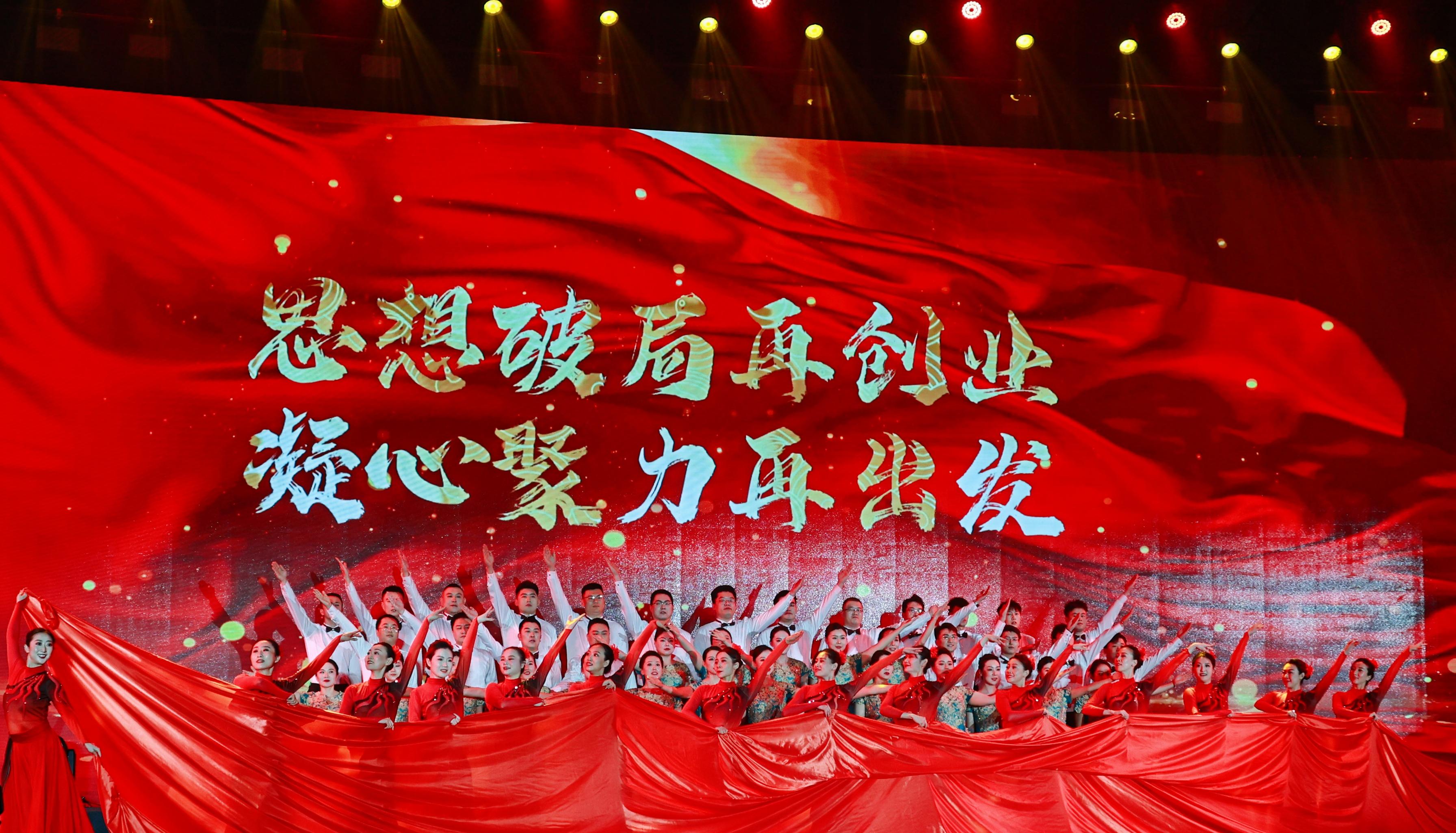 隨后,文藝匯演在歌舞《高歌行進》中正式拉開帷幕?!安煌鼇頃r路”“奮進正當時”與“高歌向未來”三個篇章輪番上演、精彩紛呈,生動展現(xiàn)集團改革突圍、勇挑重擔的奮進姿態(tài),全面吹響集團破局出發(fā)、再創(chuàng)輝煌的奮進號角。情景劇《堅定信念·薪火相傳》通過生動的演繹,精彩呈現(xiàn)集團70余年的發(fā)展歷程,彰顯了一代代內(nèi)蒙古交通人逢山開路、遇水架橋,埋頭苦干、擔當奉獻的精神面貌;詩朗誦《新征程 新起點》以鏗鏘有力的語言,回顧集團2024年承壓奮進的艱辛歷程,表達對未來發(fā)展的堅定信心與美好憧憬;舞蹈《守護》則以矯健的舞步,展現(xiàn)了公路養(yǎng)護工人在祖國北疆迎著酷暑、冒著嚴寒,守護1.1萬余公里公路的堅守與擔當;獨唱《駿馬奔馳保邊疆》用激蕩人心的旋律,展現(xiàn)出集團大力弘揚“蒙古馬精神”,為自治區(qū)經(jīng)濟社會發(fā)展貢獻交通力量的決心與魄力;現(xiàn)代激光群舞《新時代狂想曲》用聲光電多媒體的震撼效果,生動呈現(xiàn)集團聚焦主責主業(yè)超前布局新興產(chǎn)業(yè)、未來產(chǎn)業(yè)的宏偉藍圖和創(chuàng)新實踐,將整場演出推向高潮。演出在一首《光榮的旗》中落下帷幕,用氣勢磅礴的合唱表達集團上下以習近平新時代中國特色社會主義思想為指導(dǎo),在自治區(qū)黨委、政府堅強領(lǐng)導(dǎo)下,為全面建設(shè)社會主義現(xiàn)代化強國、全面推進中華民族偉大復(fù)興而團結(jié)奮斗的共同心聲和堅定決心。