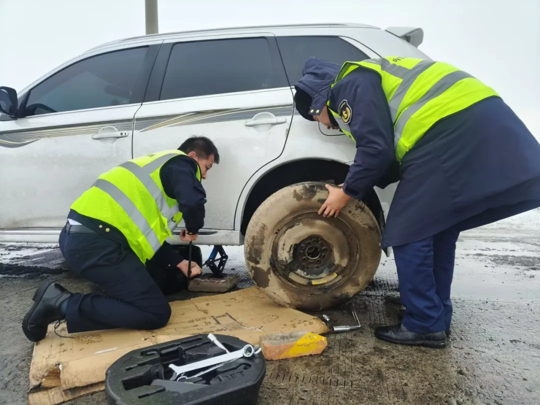 毛登收費(fèi)所職工幫助客車車主更換輪胎。