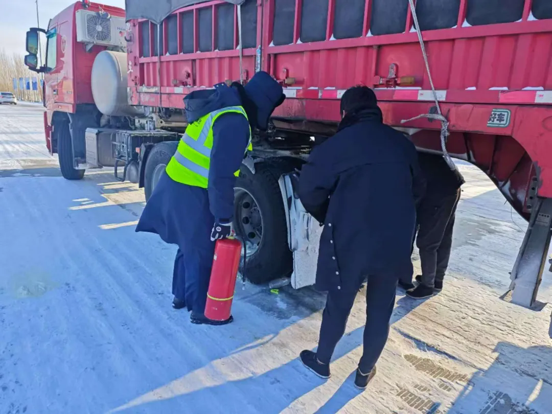 巴拉嘎爾高勒西收費(fèi)所職工幫助貨車車主撲滅輪胎起火點(diǎn)。